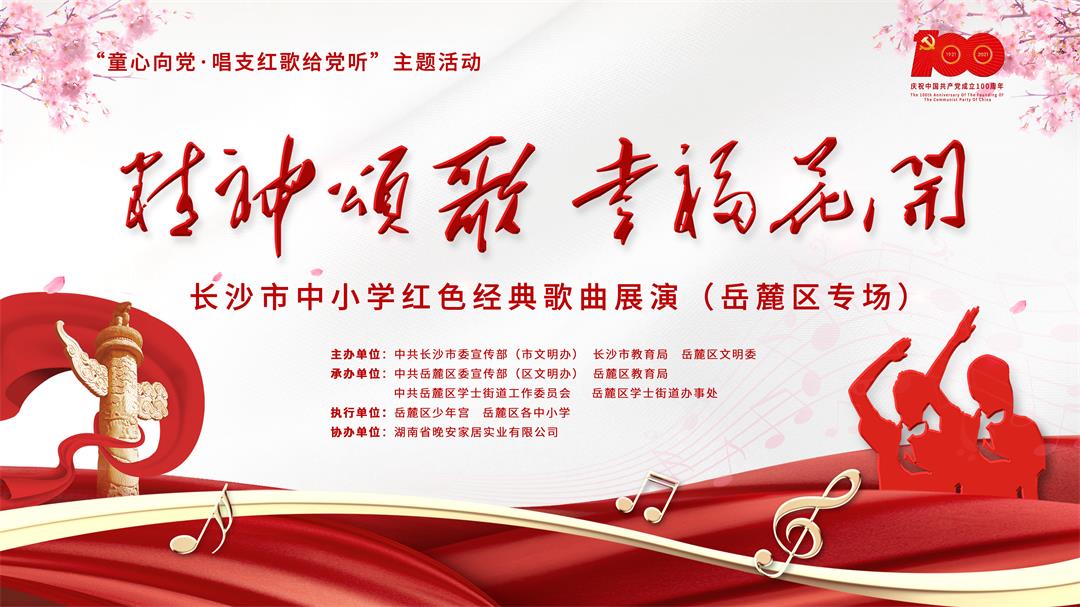岳麓区围绕庆祝中国共产党成立100周年,落实立德树人根本任务,通过举办“精神颂歌 幸福花开” ——长沙市中小学红色经典歌曲展演(岳麓区专场)活动,唱响歌颂党、歌颂祖国、歌颂新时代的优秀歌曲,传唱红色经典,用激昂嘹亮的歌声,表达爱党爱国之情。