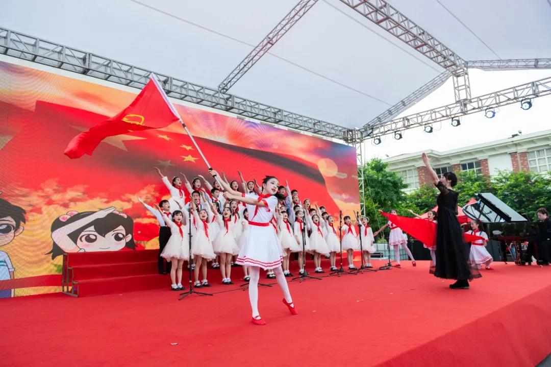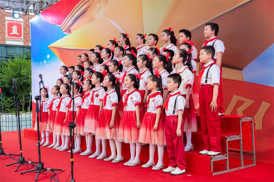 白马实验小学带来合唱《中国少年》、岳麓区第二小学带来合唱《不忘初心》、博才拓维学校带来合唱《红领巾,飘起来》、博才白鹤小学带来合唱《灯火里的中国》、湘江实验小学带来合唱《游击队歌》、湘仪学校带来合唱《国家》、博才小学带来合唱《在队旗下欢聚一堂》、西雅中学带来合唱《我爱你中国》。