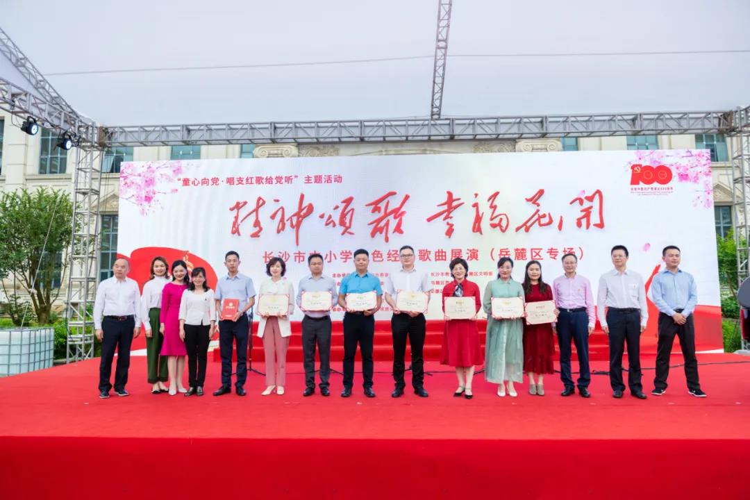 活动嘉宾共同为参演学校颁发《长沙市中小学红色经典歌曲展演(岳麓区专场)“优秀单位”》证书。