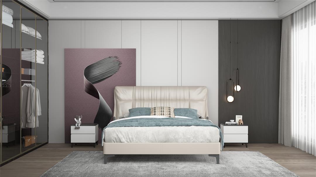 在平稳中追求突破,在突破中静心沉淀。 整体色调以深色为主,结合现代软包,增加舒适感和现代感。经典百搭的色彩和简约的造型,没有太多的造作、修饰与约束。